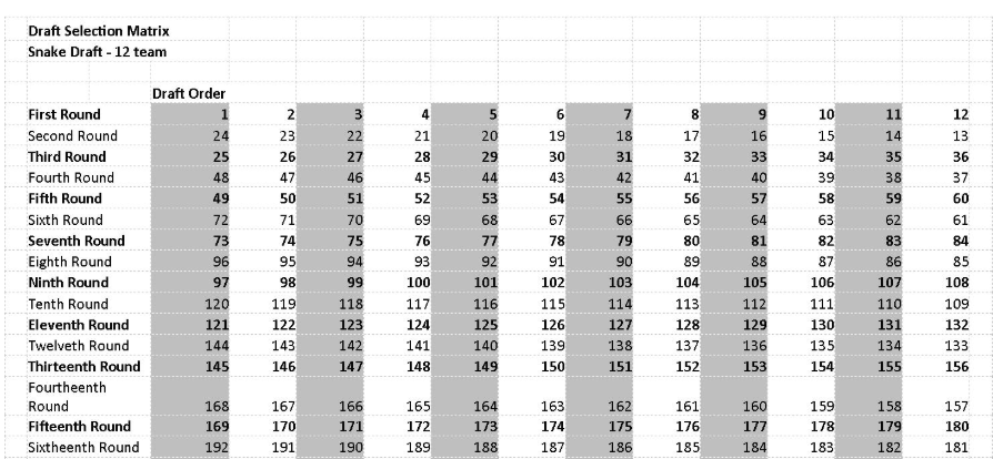 Review the example below of a Snake Draft for a twelve team Fantasy Football league.